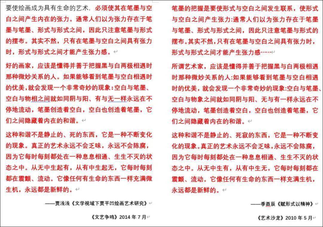 数日前,有博主发帖称,贾浅浅发表于2014年7月《文艺争鸣》的学术论文《文学视阈下贾平凹绘画艺术研究》,涉嫌抄袭四位不同作者已发表的文章。从现有证据看,其抄袭行为昭然若揭,堪称“大抄特抄”“缝合大师”,她将朱良志关于中国画的核心论点挪过来,用来夸赞贾平凹的画作;与曾令存论文的段落大面积雷同,连细节描述都一字不差;论述“笔墨与空白”时,直接挪用季酉辰的论点,仅微调个别词语;开篇的“三阶段论”更是照抄韩羽发表在贾平凹主编杂志上的文章,连极其个人化的比喻都如出一辙。